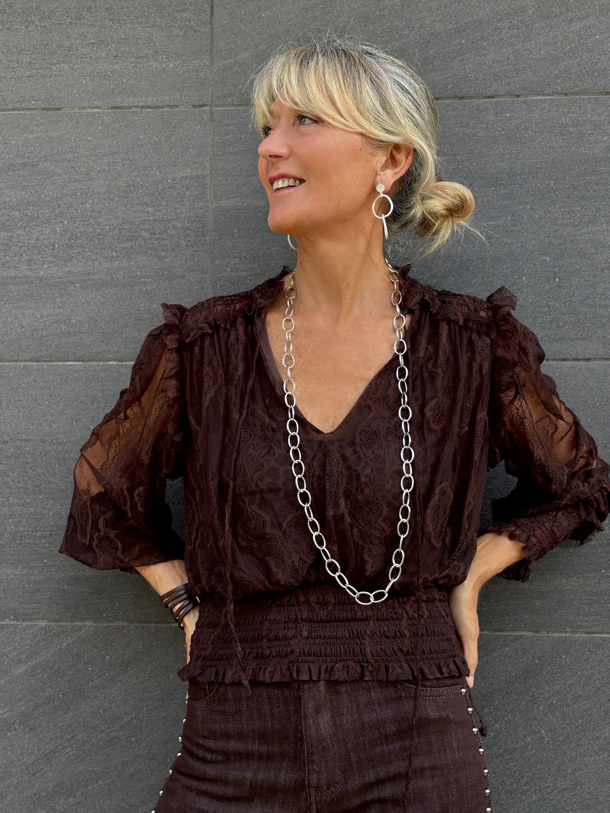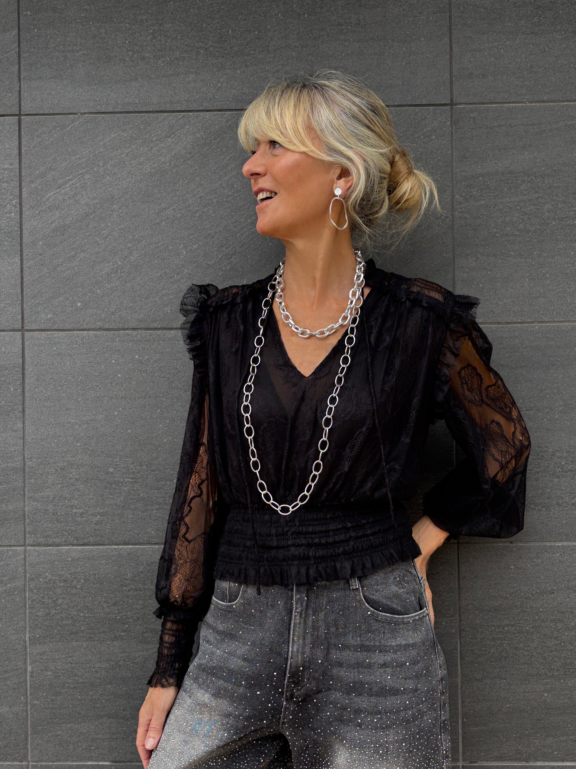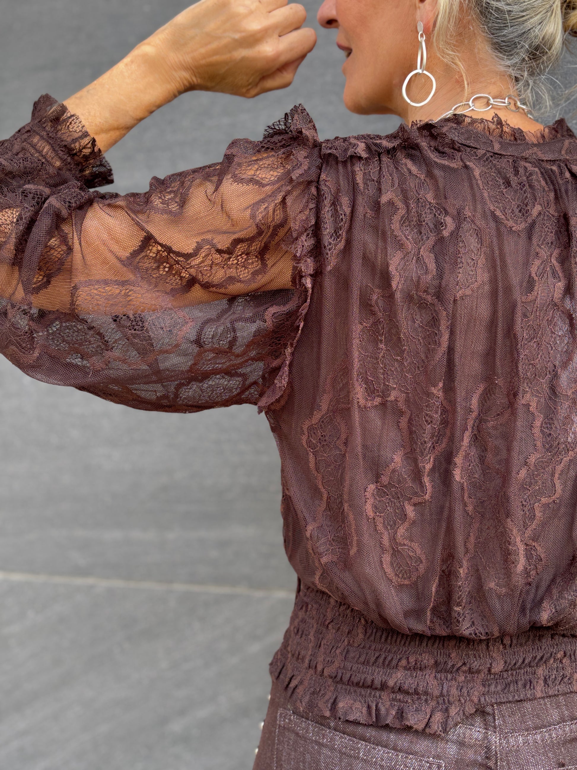 Blusa de encaje y escote en pico.