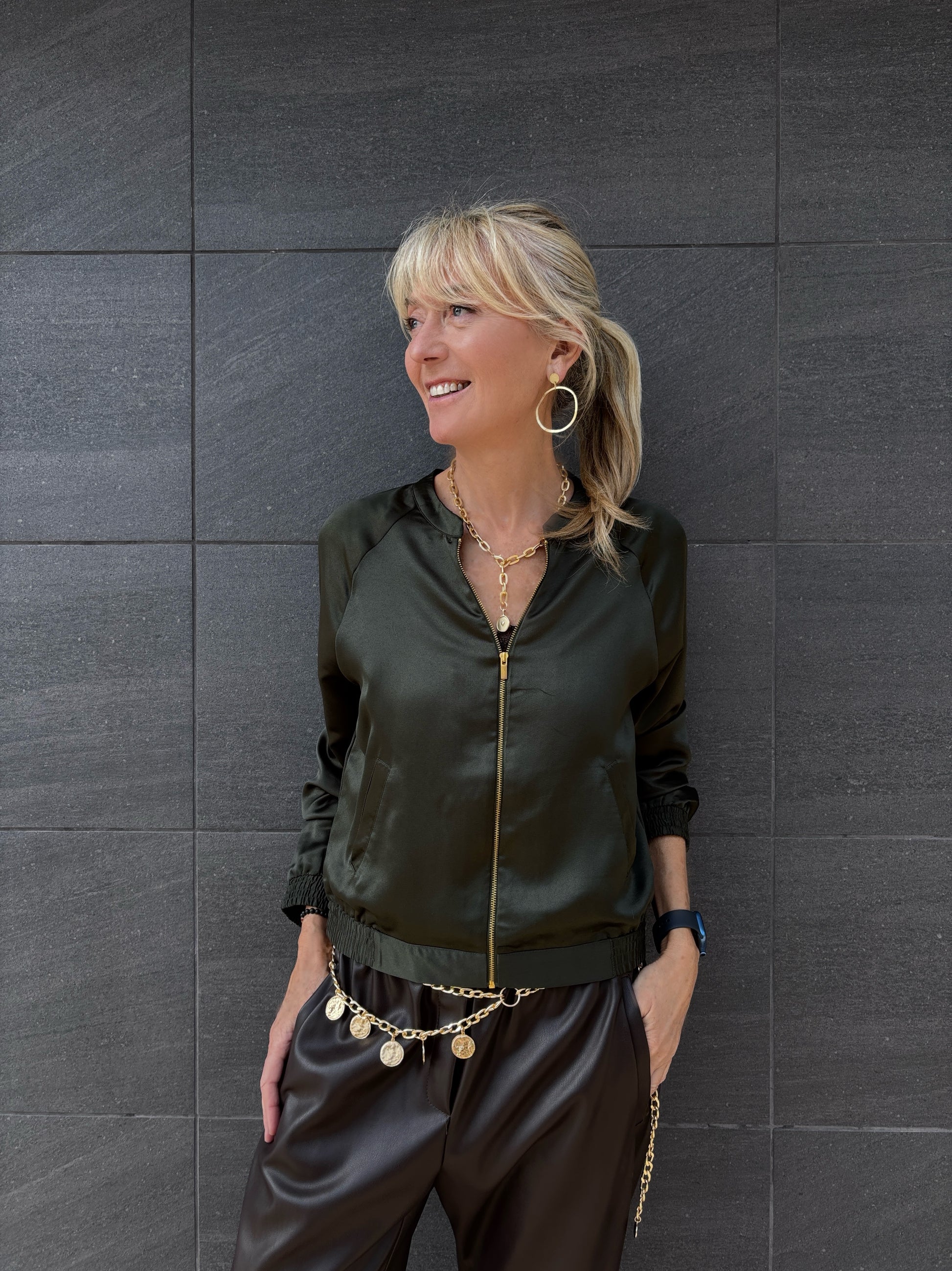 Bomber con cremallera y bolsillos oblicuos en la parte delantera.