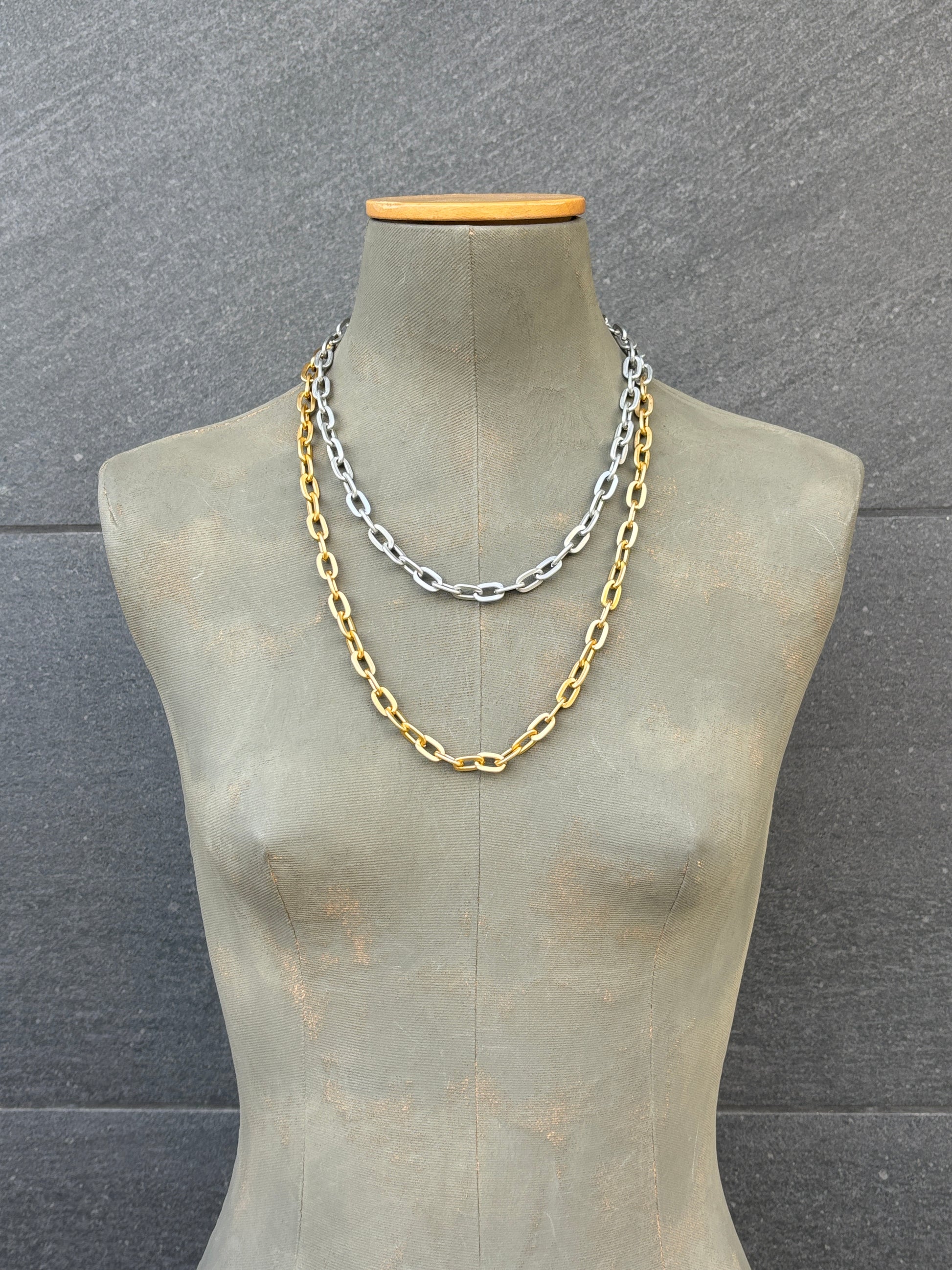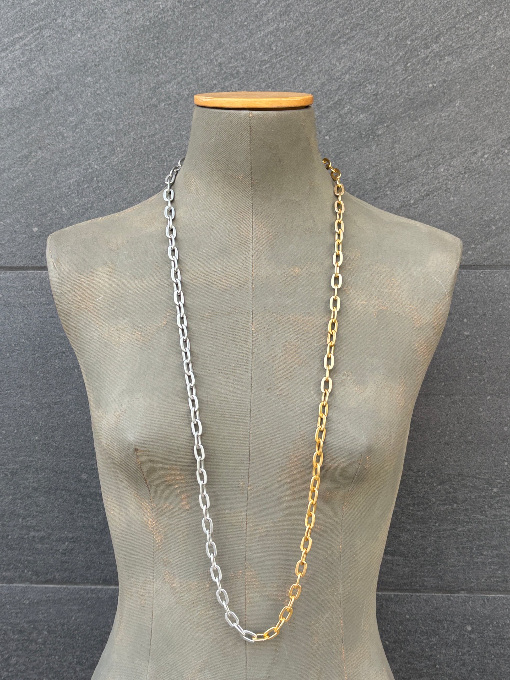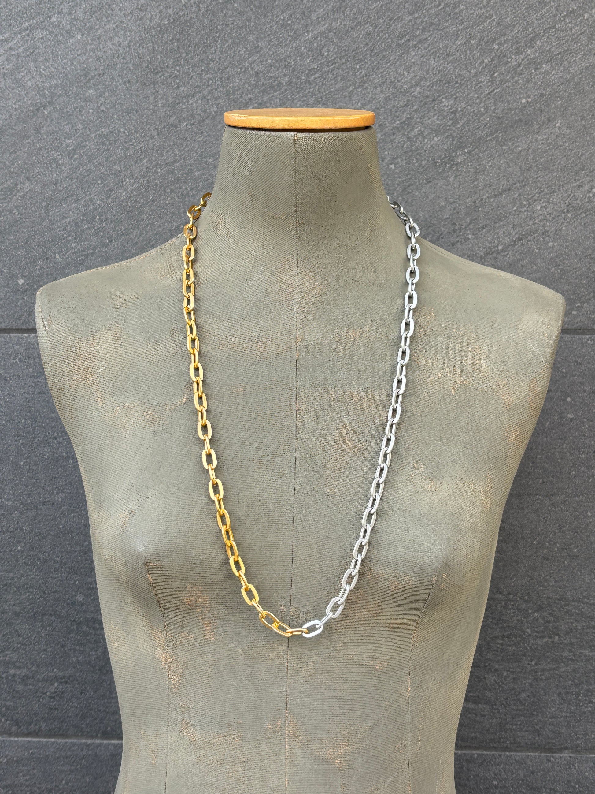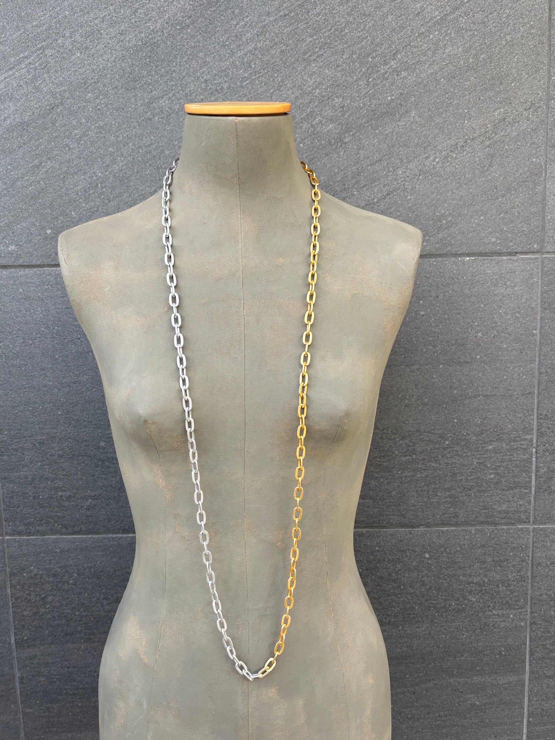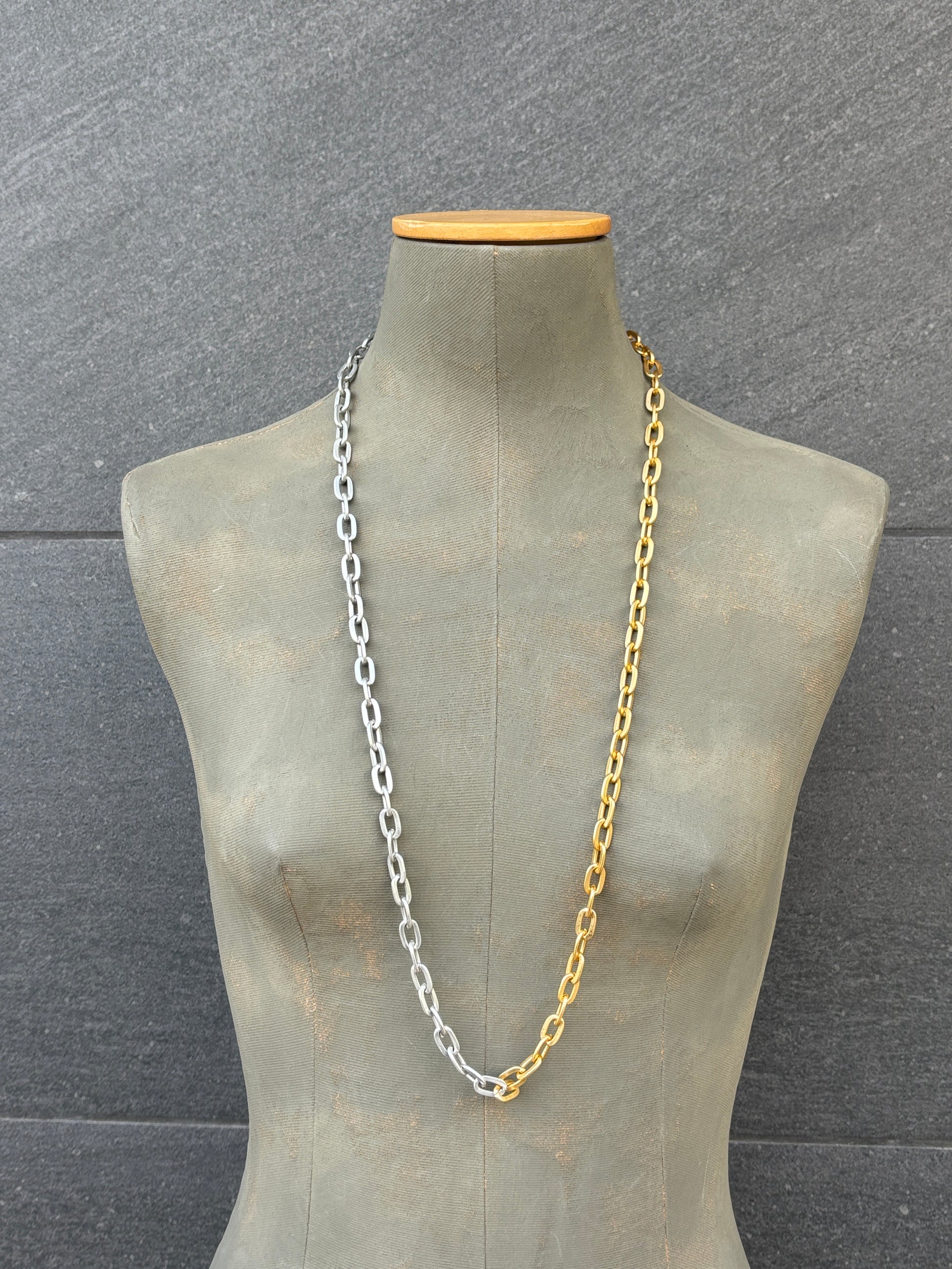 Cadena de eslabones de aluminio mitad plata, mitad dorada.