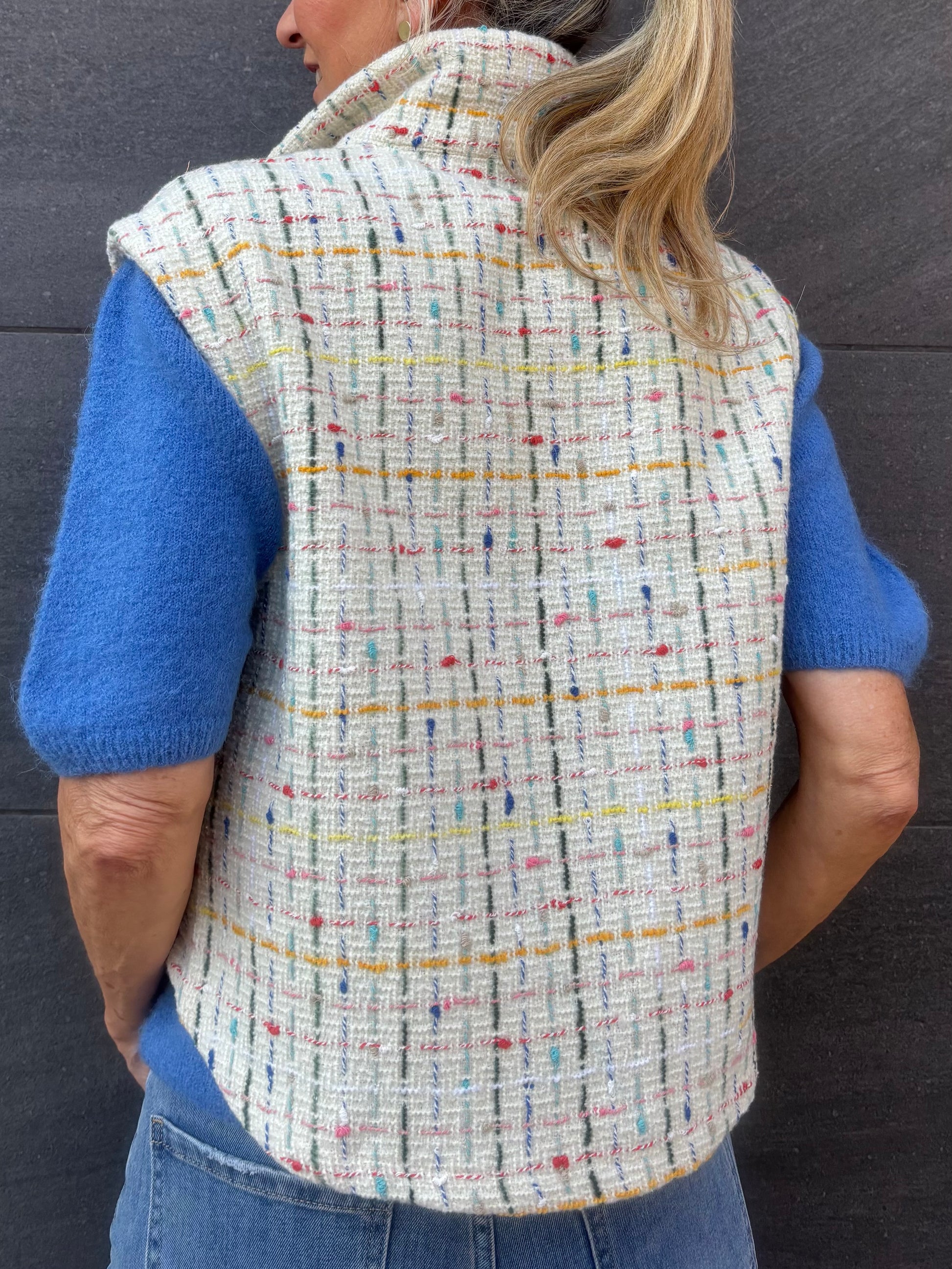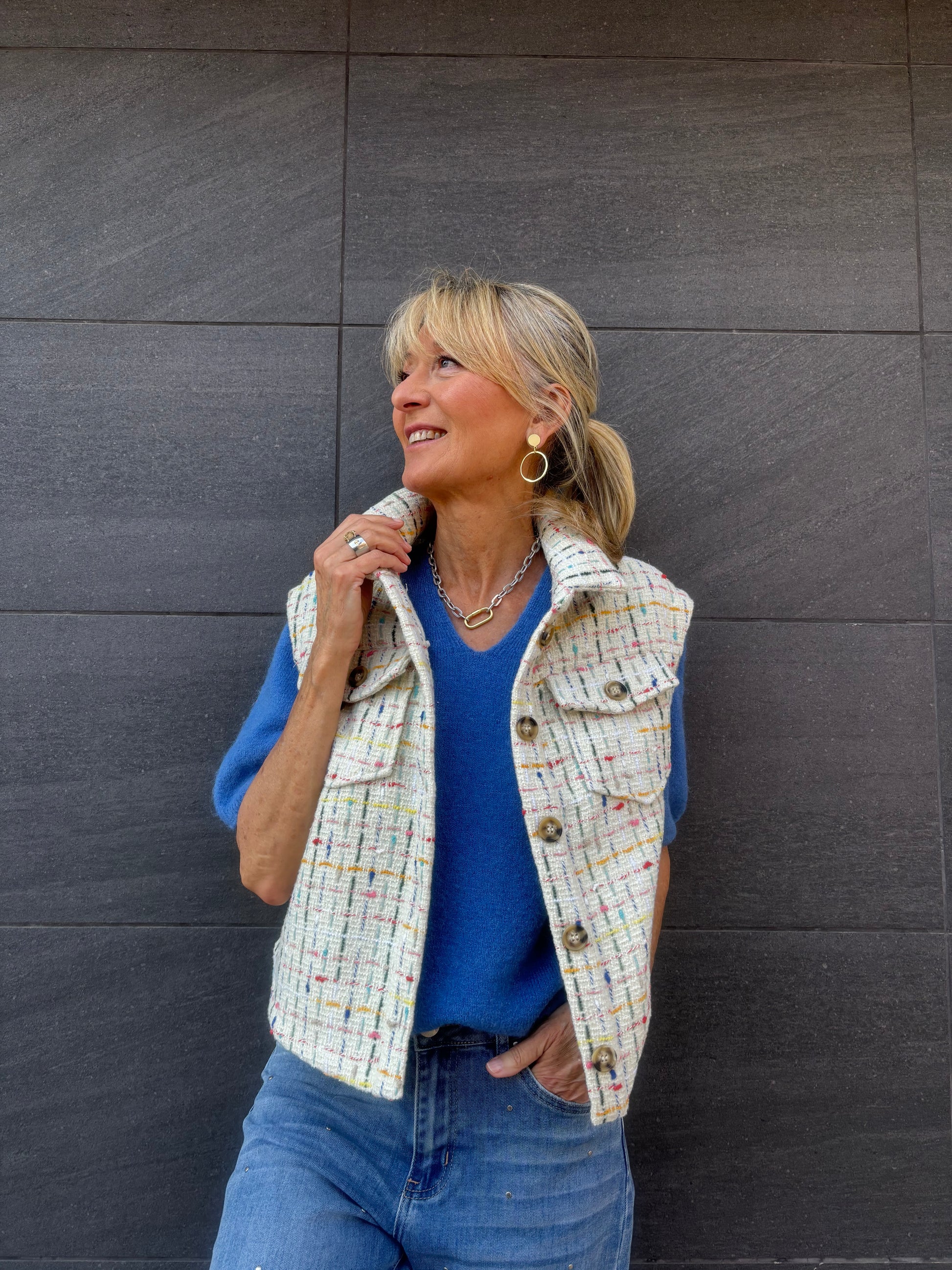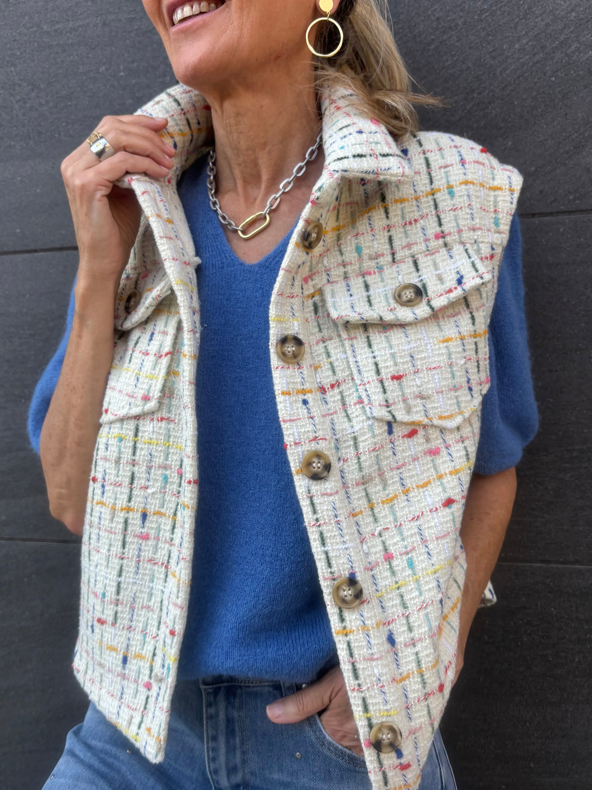Chaleco de lineas rectas y de tejido tipo tweed de textura suave.
