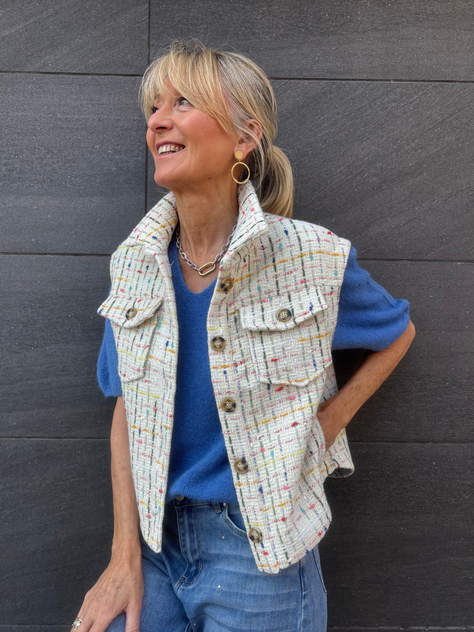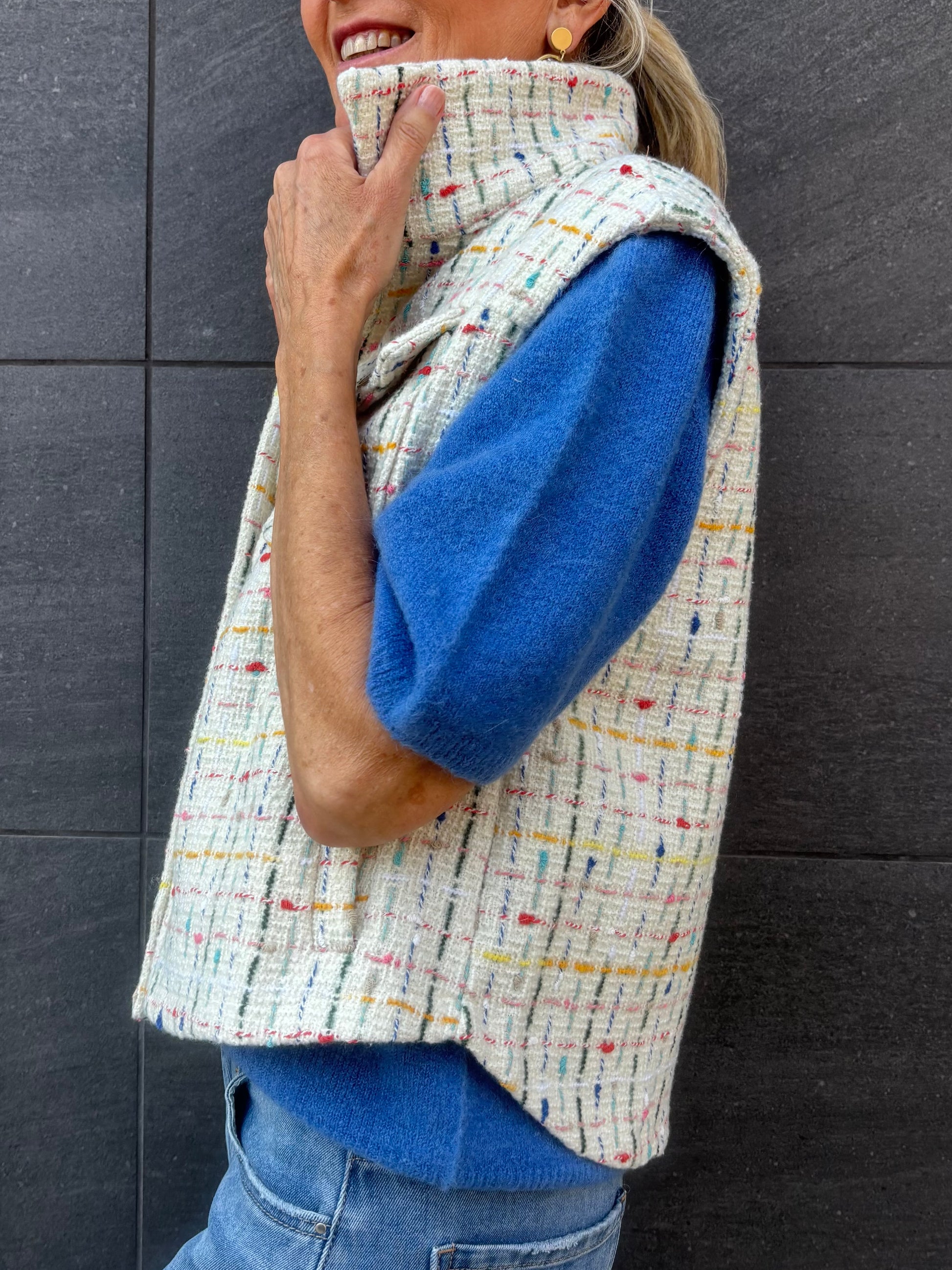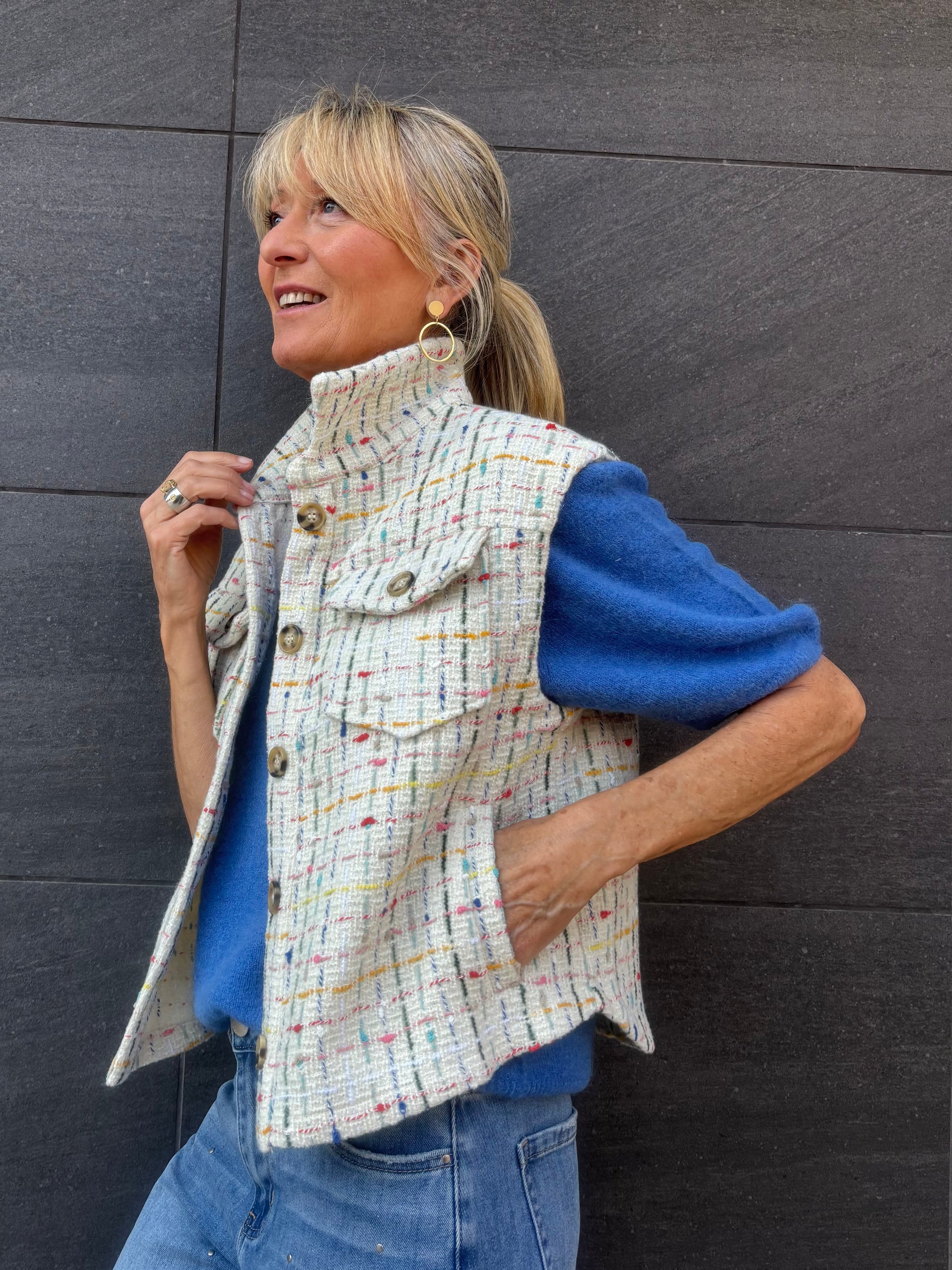Chaleco de lineas rectas y de tejido tipo tweed de textura suave.
