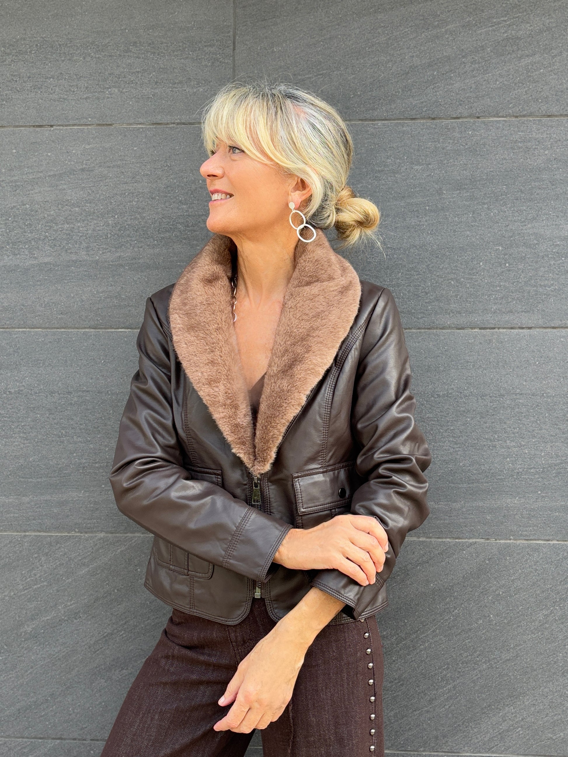 Con doble cuello que puedes optar en llevarlo o usar la chaqueta sin el.
