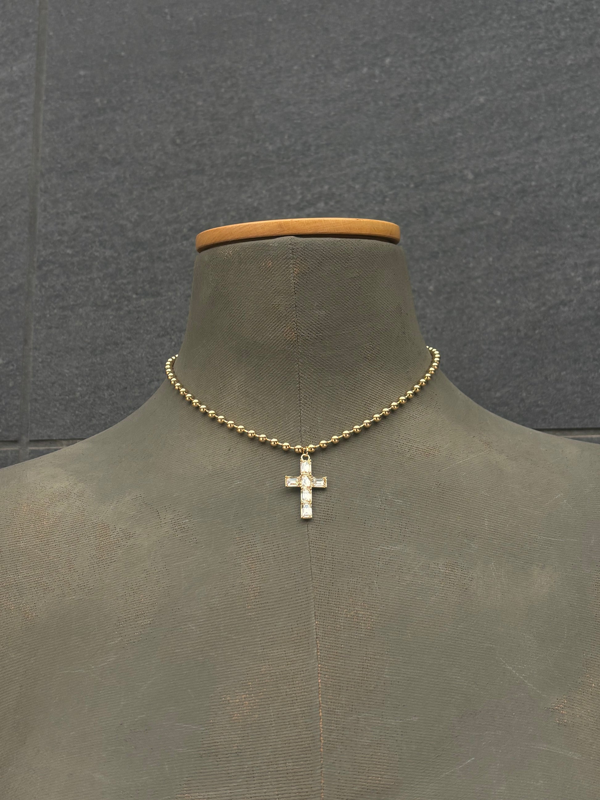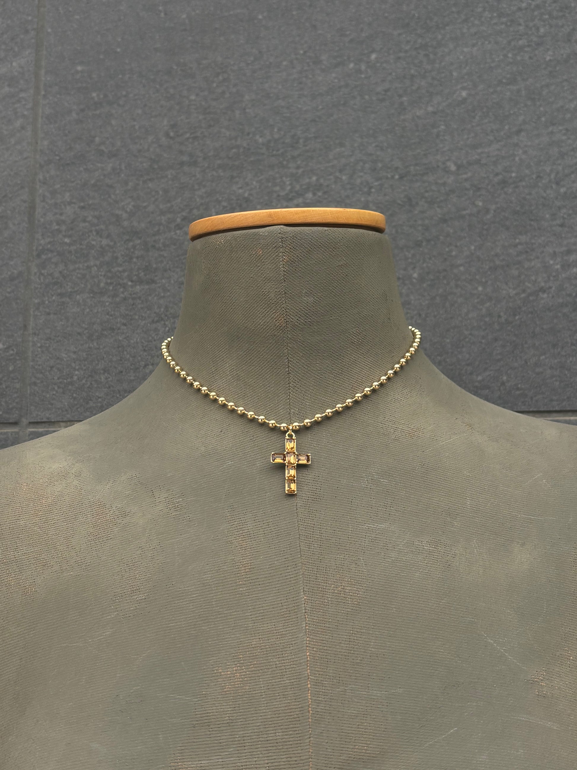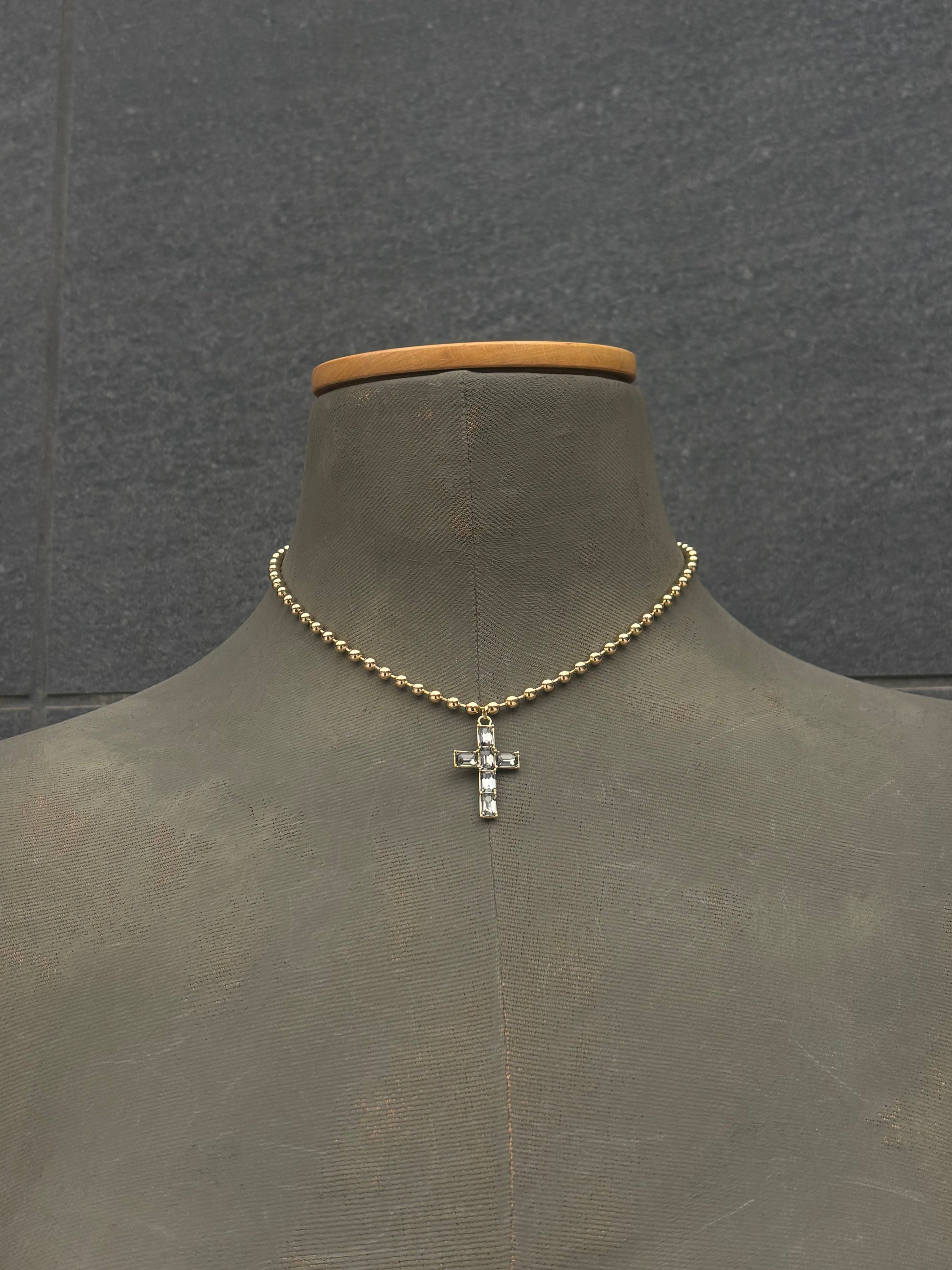 Collar de bolitas de aluminio y pieza de cruz de alta bisutería.