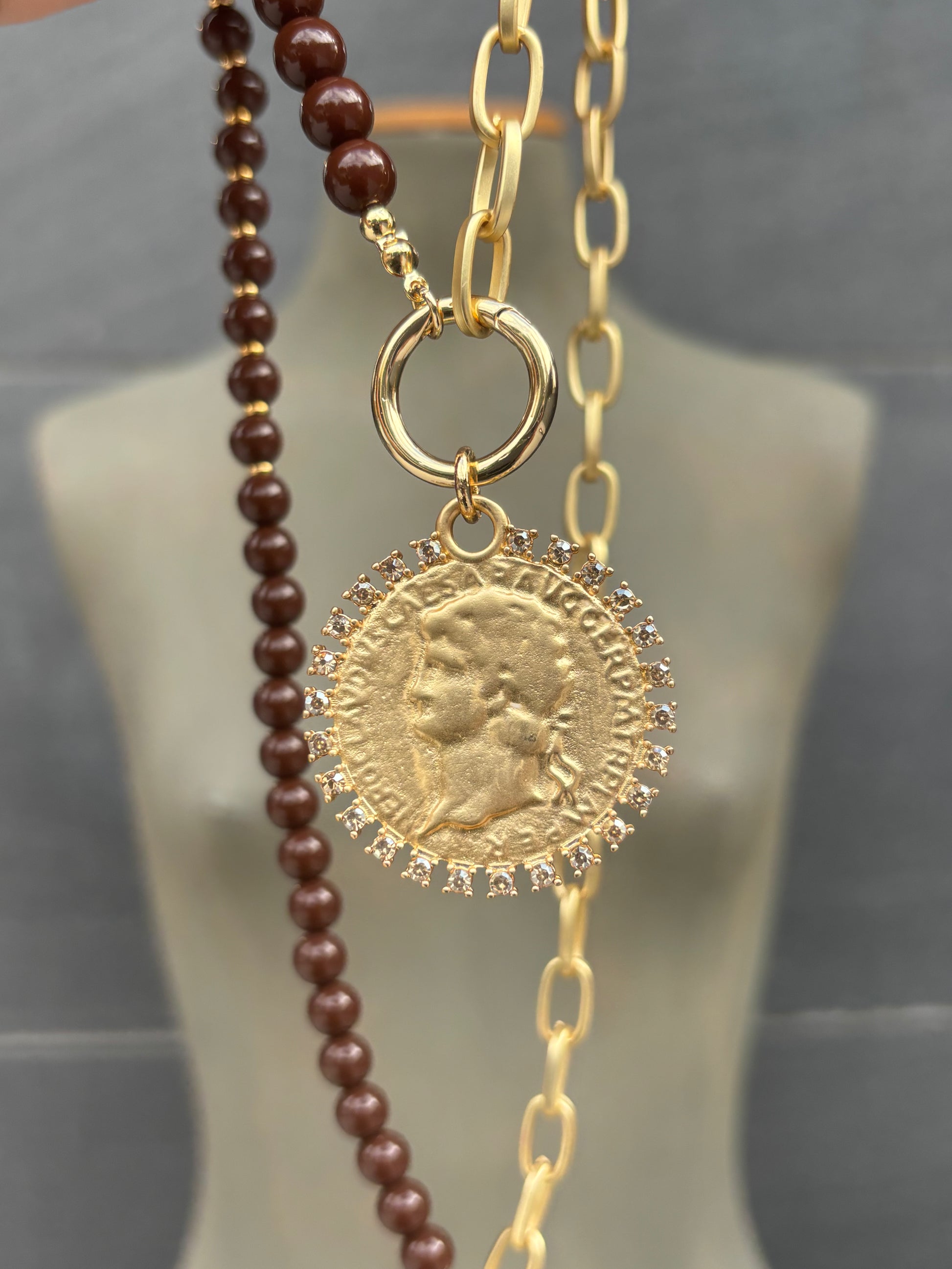 Collar de doble diseño y un medallón como pieza central de diseño de bisutería alta.
