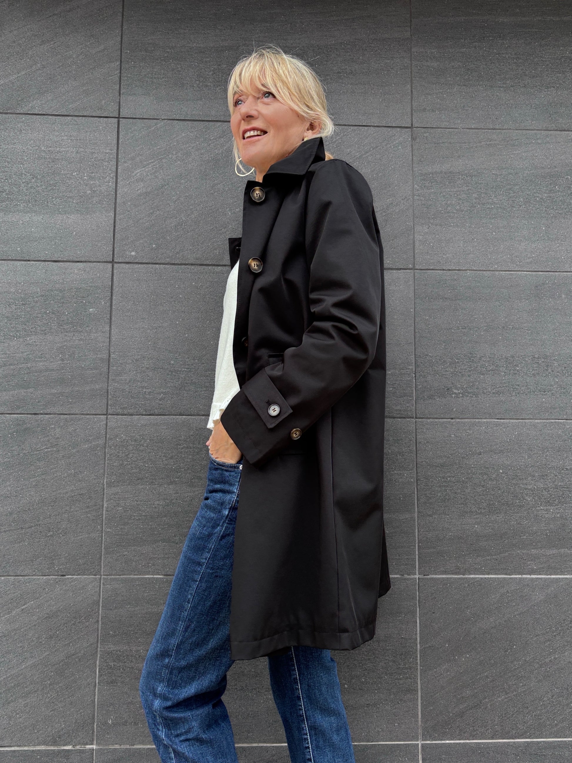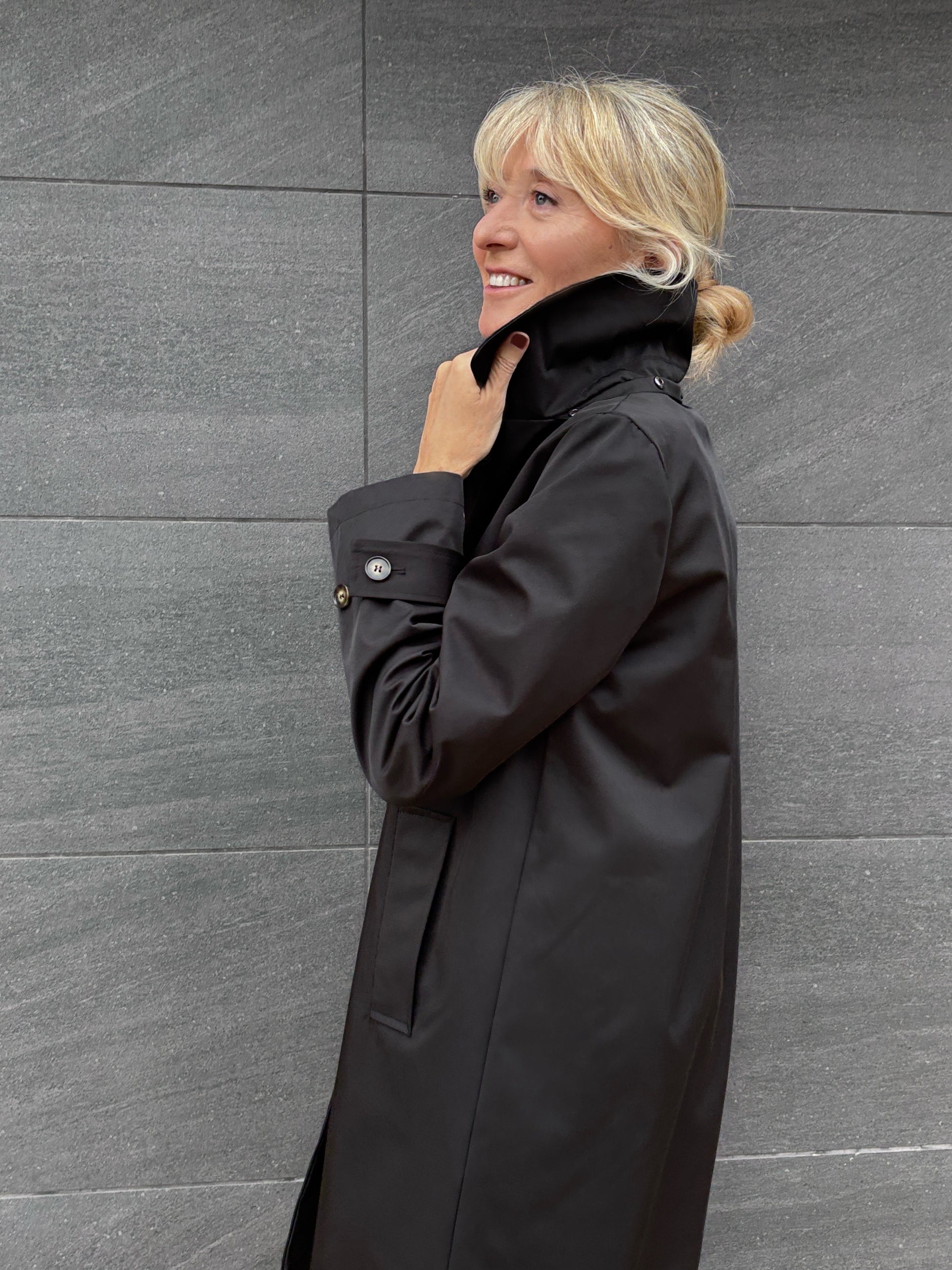 Gabardina recta con capucha desmontable.